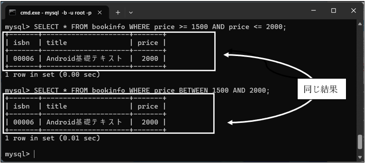 ある値の範囲でデータを抽出する場合を考えてみましょう。例えば「bookinfo」テーブルで価格が1500円~2000円のデータを検索する場合、今まで学習してきたことを使うと、