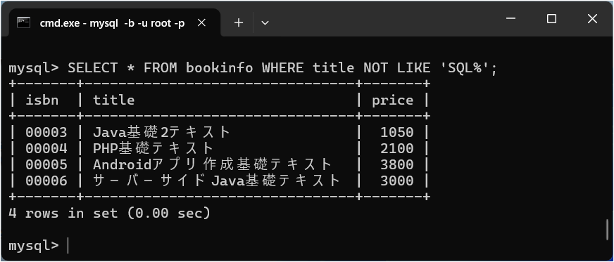 書籍名が「SQL」で始まらないもの、すなわち「SQL」で始まるデータ以外のデータが抽出されます。