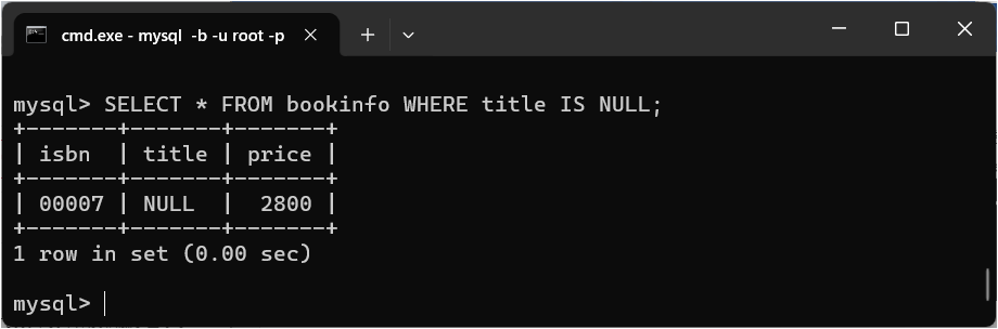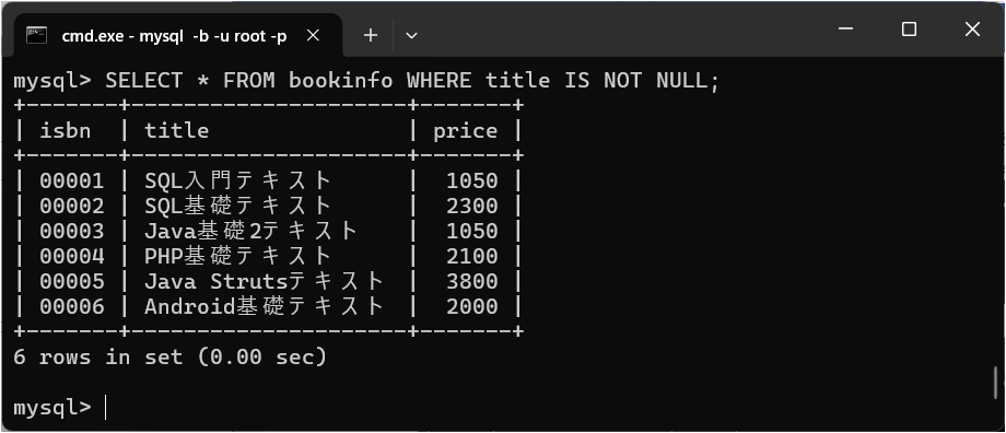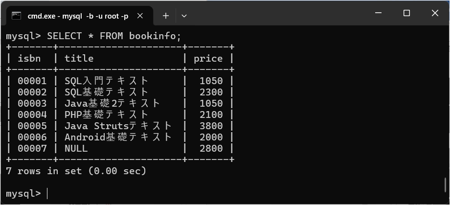 値がNULLかどうかを判定する演算子です。現在「bookinfo」テーブルにはNULLを含むデータがありませんので、まずはNULLを含むデータを作成しましょう。