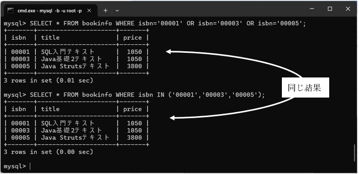例えば「bookinfo」テーブルからISBN番号が「00001」「00003」「00005」のデータを検索する場合は、