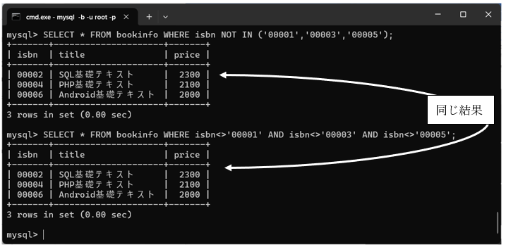これは、指定した値以外のデータが抽出されます。「bookinfo」テーブルを例にとった場合、ISBN番号が「00001」「00003」「00005」以外のデータを検索する場合は、