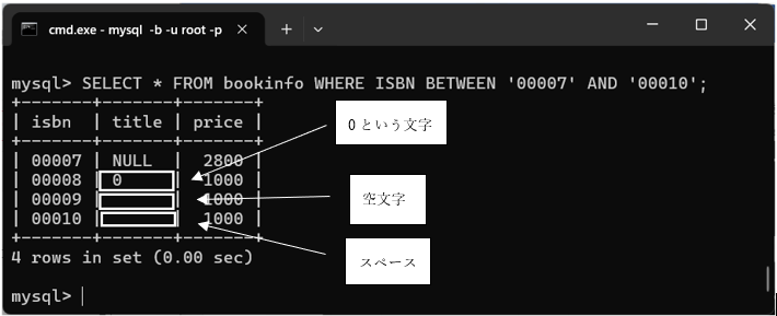 NULL(ヌルまたはナルと読みます)とは何でしょうか?NULLとは、テーブルの列に値が何も設定されていない状態を指します。これは、0でも空文字(長さが0の文字)でもスペースでもありません。MySQLクライアントでは、表示上「NULL」となります。試しに「bookinfo」に、書籍タイトルが0、空文字、スペースのデータを登録して、違いを見てみましょう。