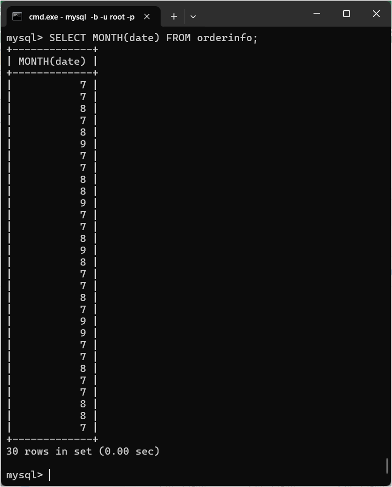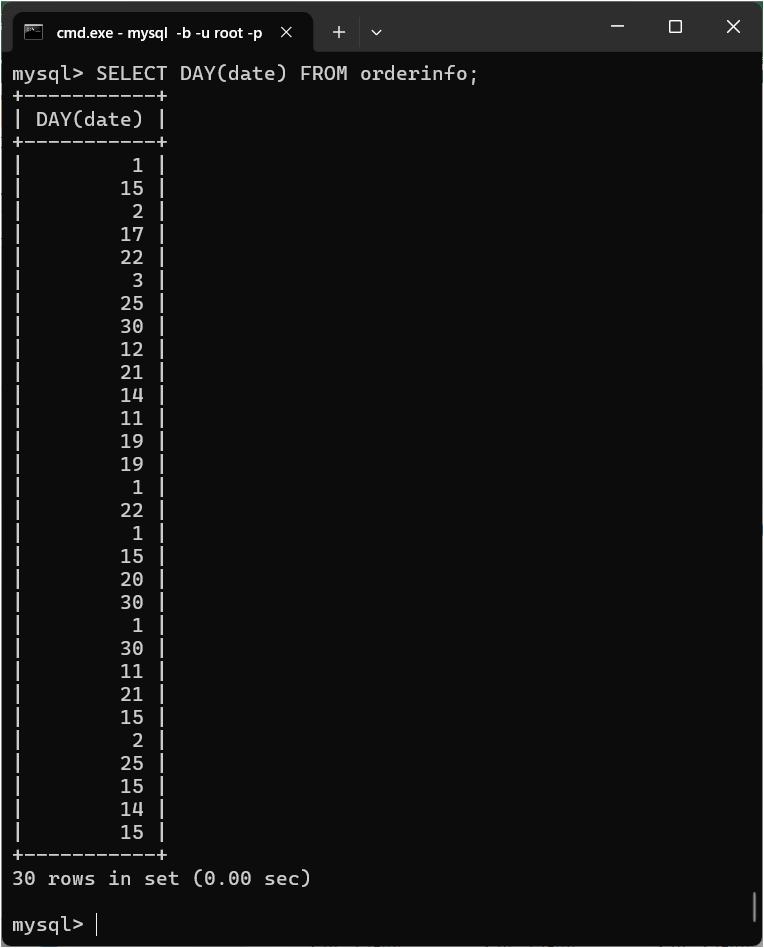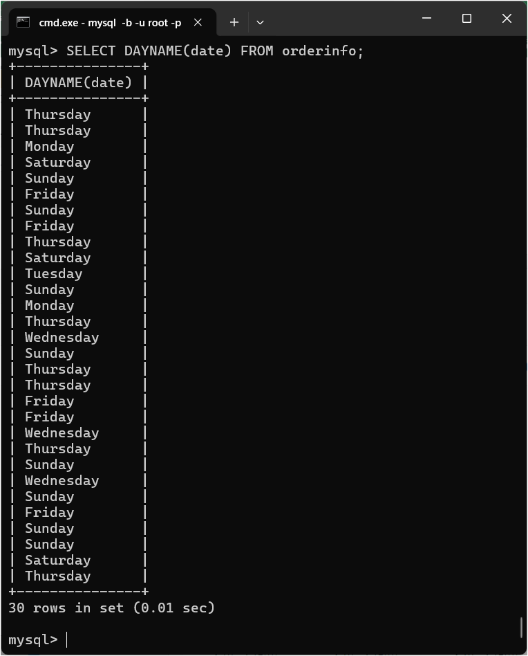 「orderinfo」テーブルの注文日付の曜日を取得する場合は、