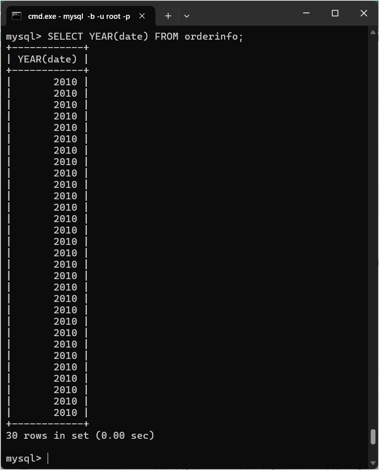 「orderinfo」の注文日からそれぞれ年、月、日を取得してみましょう。まず年です。