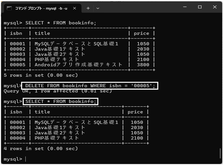 WHEREキーワードで指定した「isbnが00005」の行が削除されたことが確認できます。