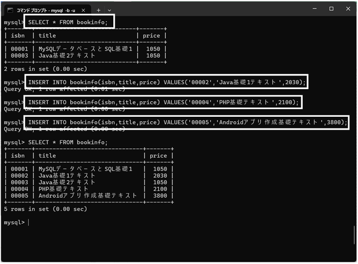 それでは、最後に復習を兼ねて「bookinfo」テーブルのデータを元の状態に戻してみましょう。
