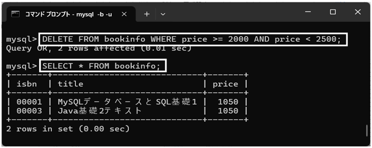 複数のデータを一度に削除したい場合「WHERE」キーワードで条件を指定します。例えば、「価格が2000以上、かつ2500未満」のデータを全て削除する場合には、以下のようなコマンドになります。