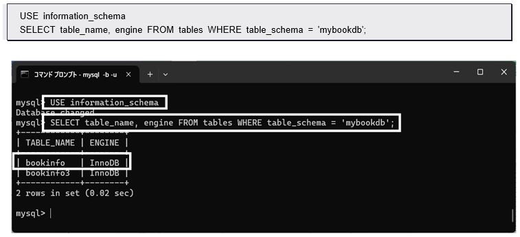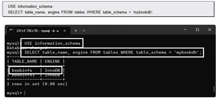 まずは、対象のテーブルのストレージエンジンを確認してみましょう。テーブルごとのストレージエンジンの情報は「information_schema」データベース内に存在します。今まで使っていた「bookinfo」について調べる場合は、以下のコマンドを実行して下さい。