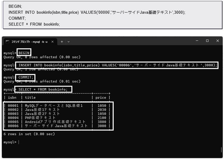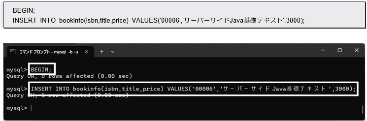トランザクション処理を開始するには「BEGIN」コマンド、ロールバックするには「ROLLBACK」コマンド、コミットするには「COMMIT」コマンドを実行します。