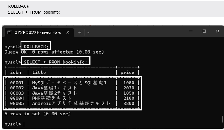 「COMMIT」コマンドを実行することでトランザクション処理の内容が確定します。  この状態で「ROLLBACK」コマンドを実行しデータを確認してみましょう。